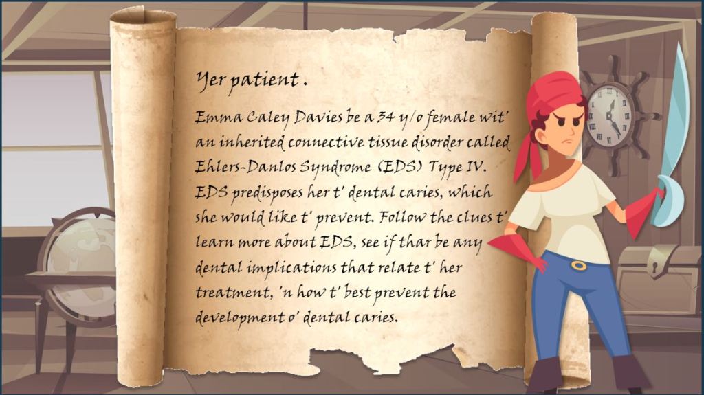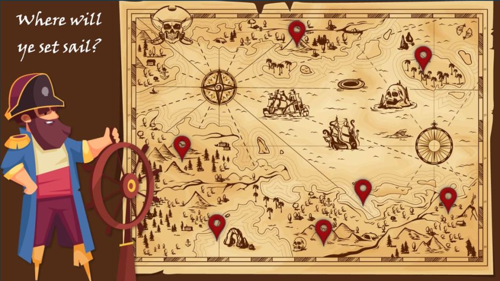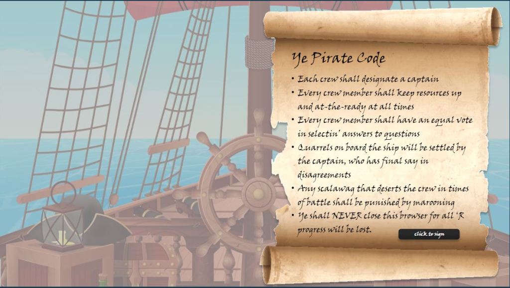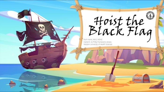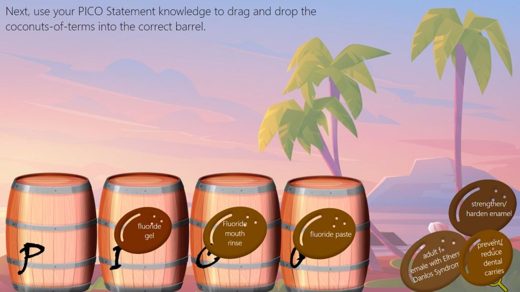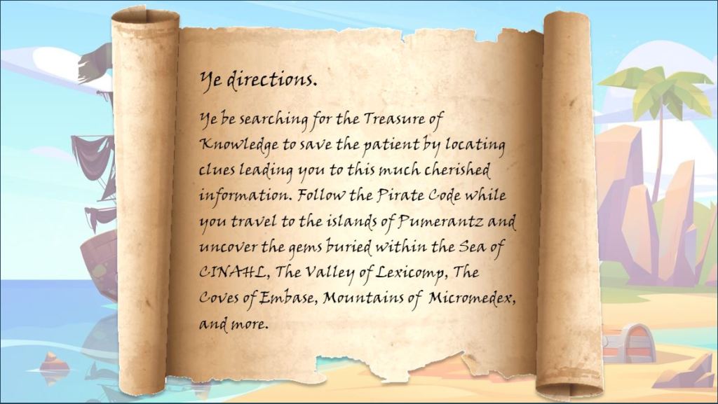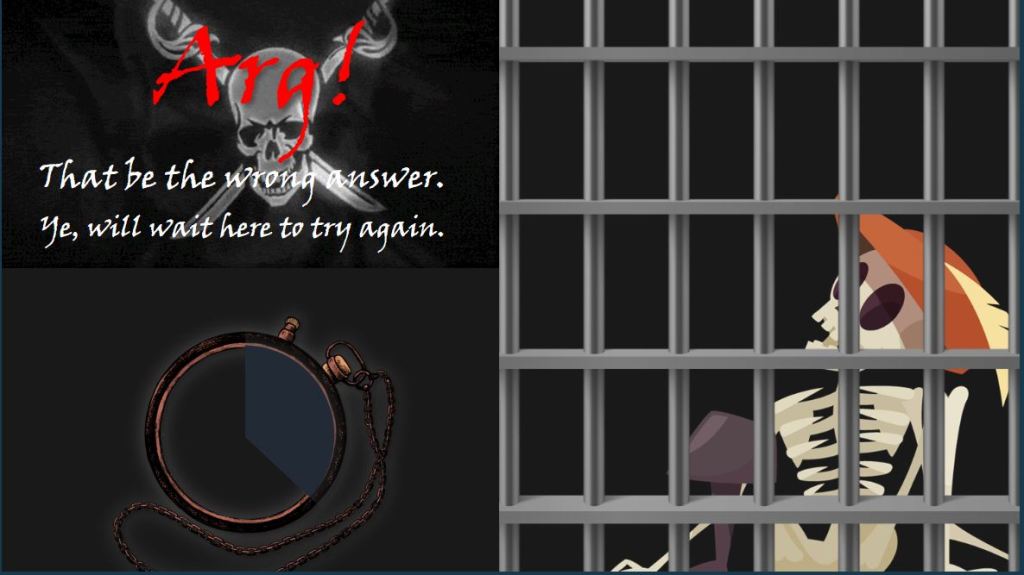 This was a very fun project to design. The subject matter expert (SME) was a librarian, teaching their first-year graduate students about conducting research with the library. Through this fun eLearning module, students were introduced to the various library databases and were coached through the development of a proper research question. Along the way, students were asked questions, and if answered incorrectly, they were placed in the brig for 15 seconds. Multimedia elements included sounds of wind, seagulls, and boat bells; and animations of waving pirate flags, sailing ships, and sharks were included to add fun and engagement for learning enjoyment.