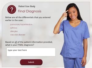 Gamification techniques are added into the creation of the e-module my means of a generated insurance invoice upon completion of the case. According to Orlando (2016), students learn best when they are challenged and working toward a goal. The ending goal of the CBL e-module is to provide proper and cost-effective healthcare to the patient. The student is rewarded for correct choices by generating revenue for the medical clinic. However, in contrast, if the student selects incorrect medical treatment options a negative amount is added to the insurance invoice. This gamification pedagogy helps students to understand that in real-world scenarios not all diagnostics are covered by the patient’s insurance plan and therefore the choices they make should be intentional.
