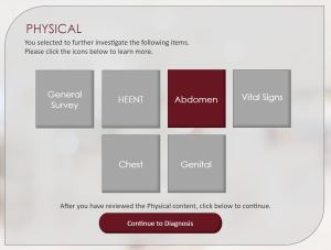 As a graduate university in health professions education that has a shared vision of educational innovation, the creation of case-based e-modules were developed to supplement student learning within the university’s physician assistant program. Throughout the course students interact with a series of patient case study e-modules that simulate a standard medical office visit within an online environment. The gamified e-modules enable the students to review patient history, complete a physical examination, request lab diagnostics, communicate differential diagnosis, and suggest a patient treatment plan. Differential diagnoses are examined at each phase throughout the simulated visit. Upon completion of the case the student is presented with the patient’s final insurance bill, as well as a recap of their progress throughout the case. The professor can evaluate the student’s thought process in the form of their progressive differential diagnoses which is printed at the conclusion of the e-module case study.