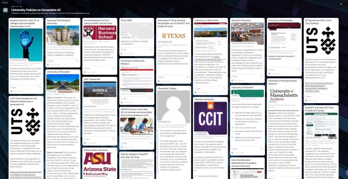In July, I began exploring AI Policies in Higher Education and curated a Padlet board, highlighting intriguing policy language. I’ve shared this board in various presentations and within LinkedIn; within 1-month on LinkedIn the post with this Padlet has received over 9,500 impressions, received 160 reactions, 30 comments, and 32 reposts/shares. This Padlet was my own internal working-process to gather and review AI Policies at various college and university campuses, and it was exciting to see that this format was helpful for so many others.