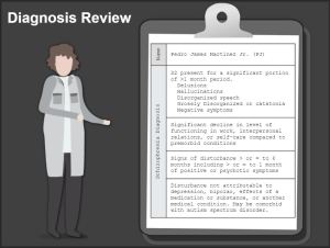 The complicated branching scenario in the eLearning module includes over 80 slides, 40 layers, 35 interactions, 20 variables, over 100 triggers, and a result slide that captures the student’s choices along the way. Additionally, all the representative artwork integrated within the design was created by individuals living with schizophrenia.