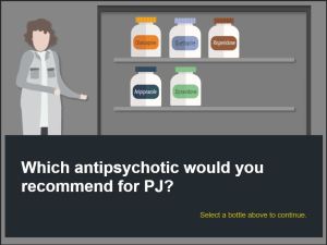 It was a question posed by our Subject Matter Expert (SME), a respected pharmacist and professor at the university. The SME wanted to reimagine his lecture on therapeutic medication for a schizophrenia diagnosis. Bandersnatch’s creative layout and extensive branching scenarios provided the ideal format for a schizophrenia patient case study, and Articulate Storyline was the only authoring tool powerful enough to make this idea come to life.