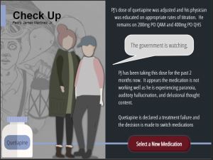 Throughout the education path, the student learns about the prescribed medication, answers questions, participates in interactions, and discovers common medication side-effects. The side-effects ultimately overwhelm PJ, and the learner is forced to return to the virtual pharmacy slide to choose another medication for the patient. Intricate triggers are integrated within the module forcing the student to learn about, and exhaust, all medication options until the correct medication appears on the pharmacy shelf thereby proving the ending path of the case simulation.