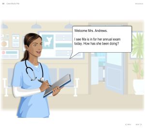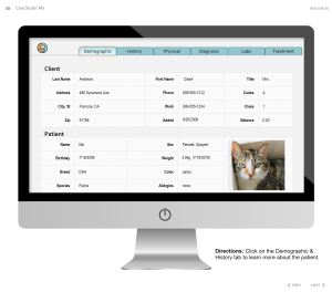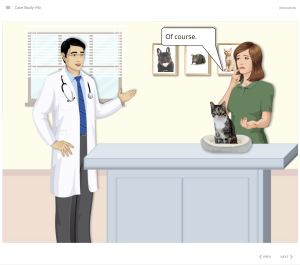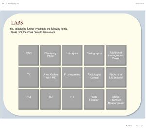 This project is a case simulation made in Articulate Storyline. Ma is a 14-year-old house cat that is brought into the Vet’s office for a check-up. The student will review the client chart via a reconstructed ERM patient chart interface. The student will learn from the patient’s medical history via the ERM and by asking the patient’s owner a series of questions. Next the student will receive information regarding the patient’s physical. Based on the information received the student will select appropriate lab work from the ERM interface, based on a budget set by the owner. If the student requests lab work that is above the budget threshold, the owner will not approve the lab work and the student must reevaluate their selections. Results from the selected lab work will be revealed and upon conclusion, the student must diagnose the patient and recommend treatment. All student selections and text entries are captured within two reports at the conclusion of the case.