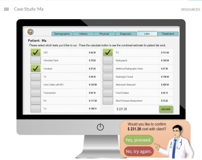 This project is a case simulation made in Articulate Storyline. Ma is a 14-year-old house cat that is brought into the Vet’s office for a check-up. The student will review the client chart via a reconstructed ERM patient chart interface. The student will learn from the patient’s medical history via the ERM and by asking the patient’s owner a series of questions. Next the student will receive information regarding the patient’s physical. Based on the information received the student will select appropriate lab work from the ERM interface, based on a budget set by the owner. If the student requests lab work that is above the budget threshold, the owner will not approve the lab work and the student must reevaluate their selections. Results from the selected lab work will be revealed and upon conclusion, the student must diagnose the patient and recommend treatment. All student selections and text entries are captured within two reports at the conclusion of the case.