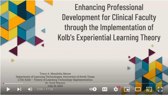 Video – Experiential Learning Implementation Presentation Type: Video Software: PowerPoint Canva Slidesgo Created: 2023 Client: LTEC 6220 Related Published by Tracy Mendolia-Moore View all posts by Tracy Mendolia-Moore