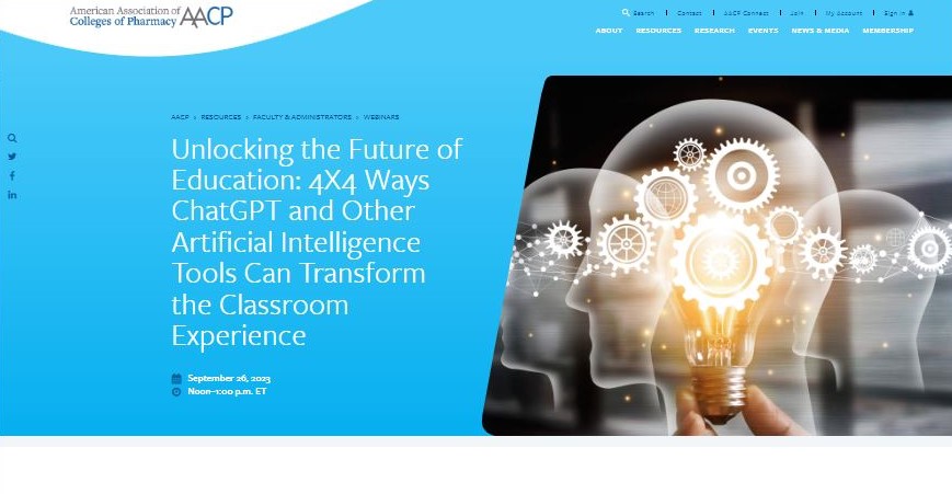 This Continuing Education (CE) webinar explored the innovative ways ChatGPT and other artificial intelligence tools can be used in the classroom. Insightful discussions guided the target audience of pharmacists and pharmacy educators through the 4 ways ChatGPT can be used in the classroom, 4 ways to minimize cheating with AI tools, 4 ways ChatGPT and other AI tools can be used to assist faculty, and 4 ways students can use ChatGPT as a study tool. The active learning session included an interactive Padlet board to increase backchannel learning opportunities among the 200+ live attendees. The recorded session can be purchased online through the AACP website and is available to view asynchronously with a quiz to earn CE credit for the training.
